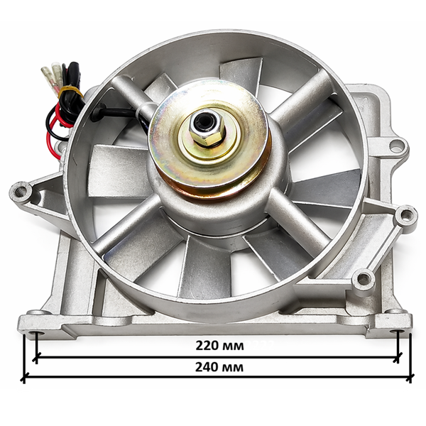 Конструкция включает литой корпус, крыльчатку вентилятора, центральный вал, шкив ременного привода и встроенный генератор. Вращение передается от двигателя через ремень на шкив вентилятора. Во время работы крыльчатка создает мощный поток воздуха, улучшая отвод тепла и помогая двигателю стабильно работать при длительных нагрузках, а также в условиях повышенной температуры.